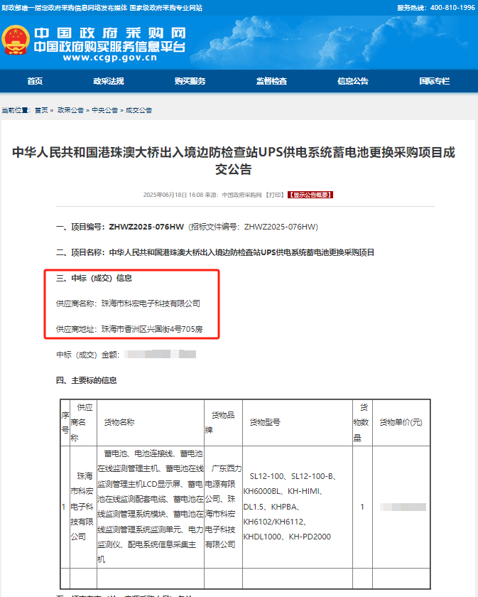 成功中標(biāo)“中華人民共和國港珠澳大橋出入境邊防檢查站UPS供電系統(tǒng)蓄電池更換采購項(xiàng)目”。
